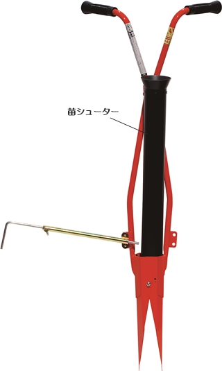 バネの力でスキが閉じる方式。 ハンドルを握って開くだけで穴あけと植付の同時作業。