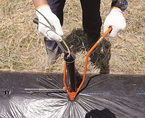 マルチの上から差し込み、開閉するだけで穴あけと植付の同時作業。